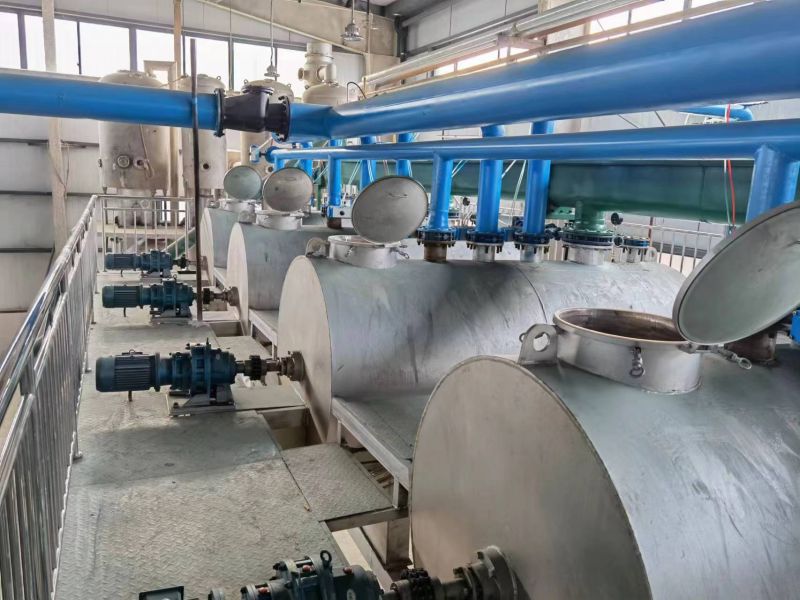 層蝶式汽提塔是國內浸出油廠使用較多的一種汽提設備。若按照水蒸氣對混合油的汽提次數,層蝶式汽提塔可分為單段式和雙段式兩種。雙段蝶式汽提塔,它主要有頂蓋、上塔體、中塔體、下塔體以及底蓋所組成。在上塔體和下塔體內各有6-9組碟盤。每組碟盤都由滯流盤、錐形分配碟和環形分配碟組成。上、下塔體的外殼均裝有夾套,在夾套中通入343-441kPa的加熱蒸汽對塔內的混合油進行間接加熱。中塔體和底盤內各有一組直接蒸汽噴入裝置。這組裝置由集油盤、導流管、中心管、直接蒸汽噴管組成。來自第二蒸發器的混合油,進入層蝶式汽提塔的進油管之后,自上而下逐次流經每一組碟盤。到達中塔體的集油盤底的阻攔,被汽提出的溶劑蒸汽和水蒸氣繞過集油盤向上移動,而油被阻留落下。之后,混合油又沿著下塔體內的各組碟盤逐次流下,到達底蓋內,在直接蒸汽噴入裝置中又一次被汽提,汽提出的溶劑蒸汽和水蒸氣自下而上逐級通過每一組碟盤的空隙,與碟盤表面流下的液膜狀混合油充分接觸,使混合油得到進一步汽提。到達頂部的混合蒸汽通過出氣管進入汽提冷凝器。經汽提后的浸出毛油從底部的出油管通過液封裝置排出。層蝶式汽提塔結構較為簡單,操作方便,工藝效果好。但是必須注意的:每一組碟盤的制造質量和是否水平安裝,將影響混合油液膜的形成與氣液相接觸的面積;直接蒸汽含水,會造成毛油中磷脂的析出;直接蒸汽壓力過高或者用量過大,會形成液泛現象;混合油中含雜太多,則使汽提塔碟盤表面的結垢現象嚴重,毛油質量降低;若采用多段式,應使上層直接蒸汽壓力低于下層。直接蒸汽好采用低壓過熱蒸汽。層蝶式汽提塔在檢修時碟盤的清理比較麻煩。